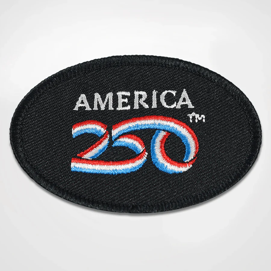 ✨ Embroidered America250™ Patch — A richly detailed 3″ x 2″ patch with merrow border, perfect for jackets, backpacks, display boards, or keepsake collections.
